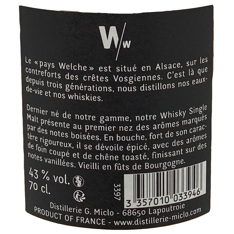 La distillerie G. Miclo a réuni le meilleur pour élaborer sos whisky : de l'orge rigoureusement sélectionnée, une double distillation, des barriques de petites contenances issues de grands domaines viticoles français et une eau pure prélevée à 950 mètres d'altitude, au-dessus de son village.
