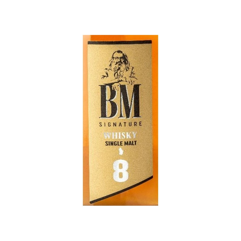 BM Signature 8 ans, un single malt whisky à la robe ambrée, s’ouvre sur des notes crémeuses et rancios, caractéristique des fûts de macvin du Jura. La bouche est bien équilibrée. L’attaque est franche puis se succèdent des notes maltées et florales.